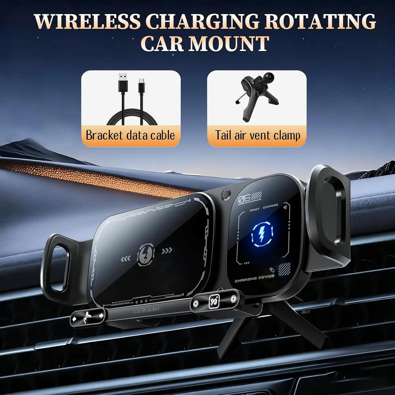 Wireless Charging Rotating Car Mount, 360° Auto Rotating Phone Holder, 15W Fast Charger, Black