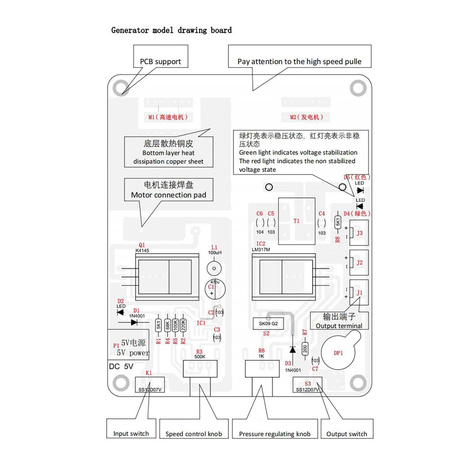(4) Lamp beads can be used for generator load, but do not short circuit the positive and negative poles of the output terminal to avoid burning out the power supply and voltage stabilizing chip.