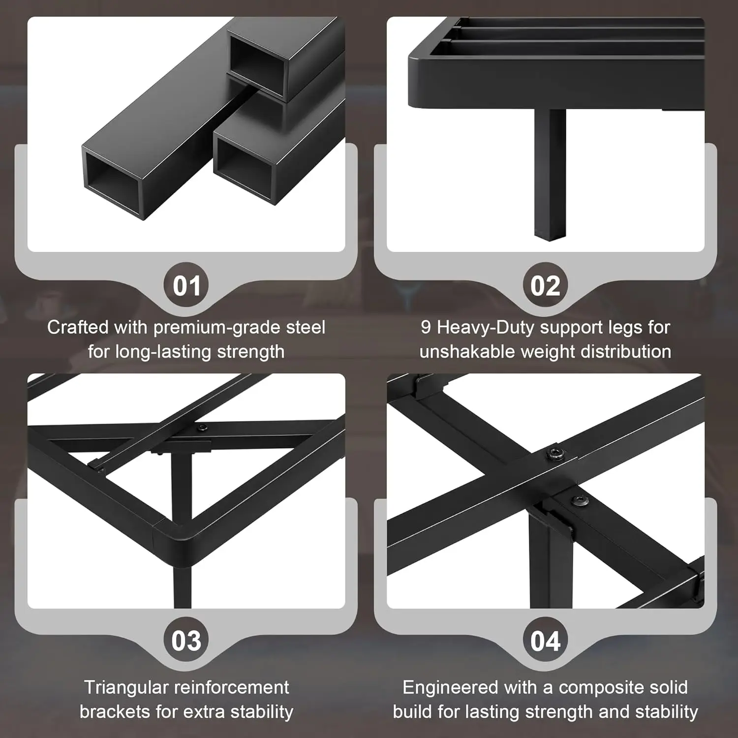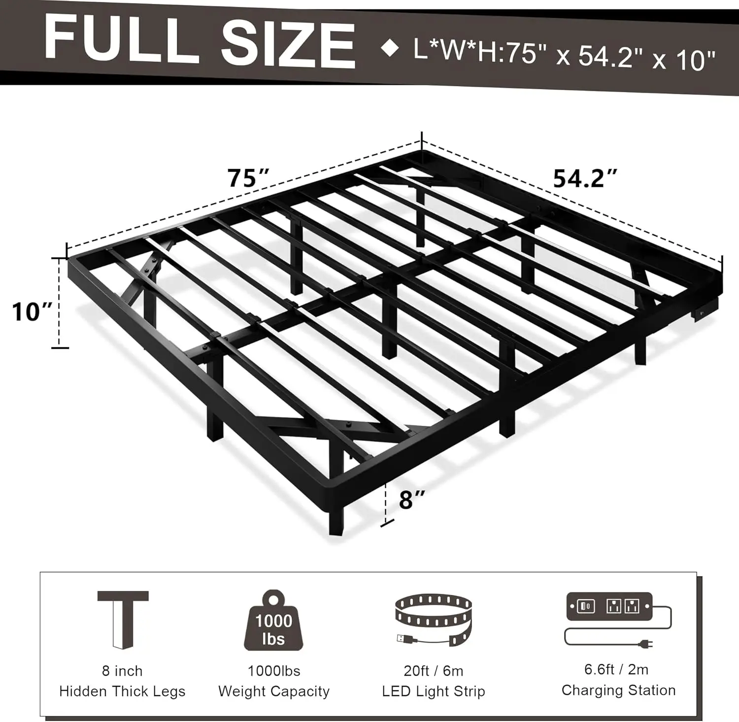 Sturdy and Durable: Supported by 11 metal slats and 9 sturdy legs with a triangular design, this modern bed frame offers exceptional stability and can support up to 1,000 lbs, ensuring a comfortable and secure sleep experience