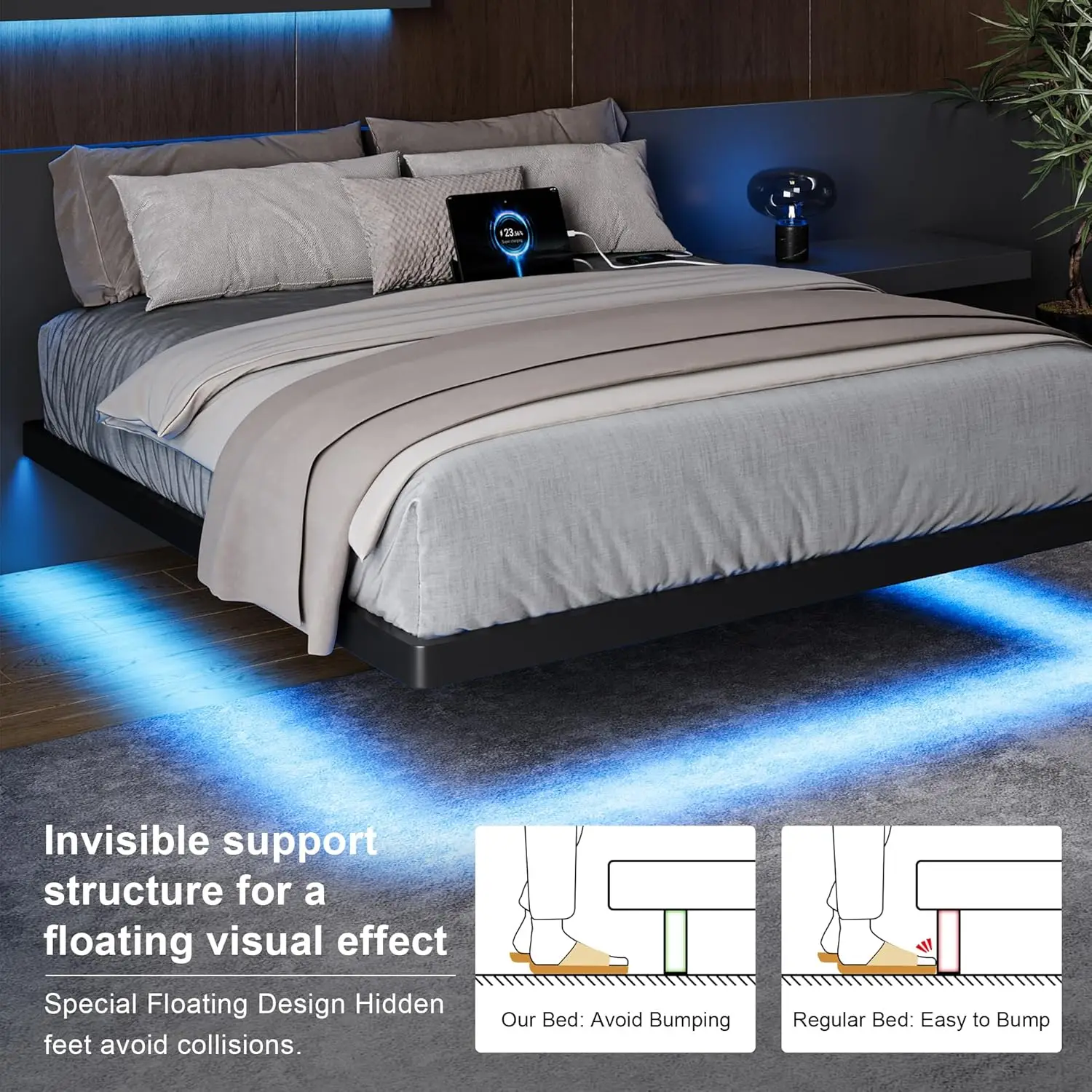 Luxury Floating Bed Frame: Experience the unique floating visual effect and modern aesthetics with this luxurious metal bed frame, which will become the focal point of your bedroom. The bedframe features built-in support legs, cleverly suspending it in the air, adding a touch of futurism to your space while preventing accidental collisions