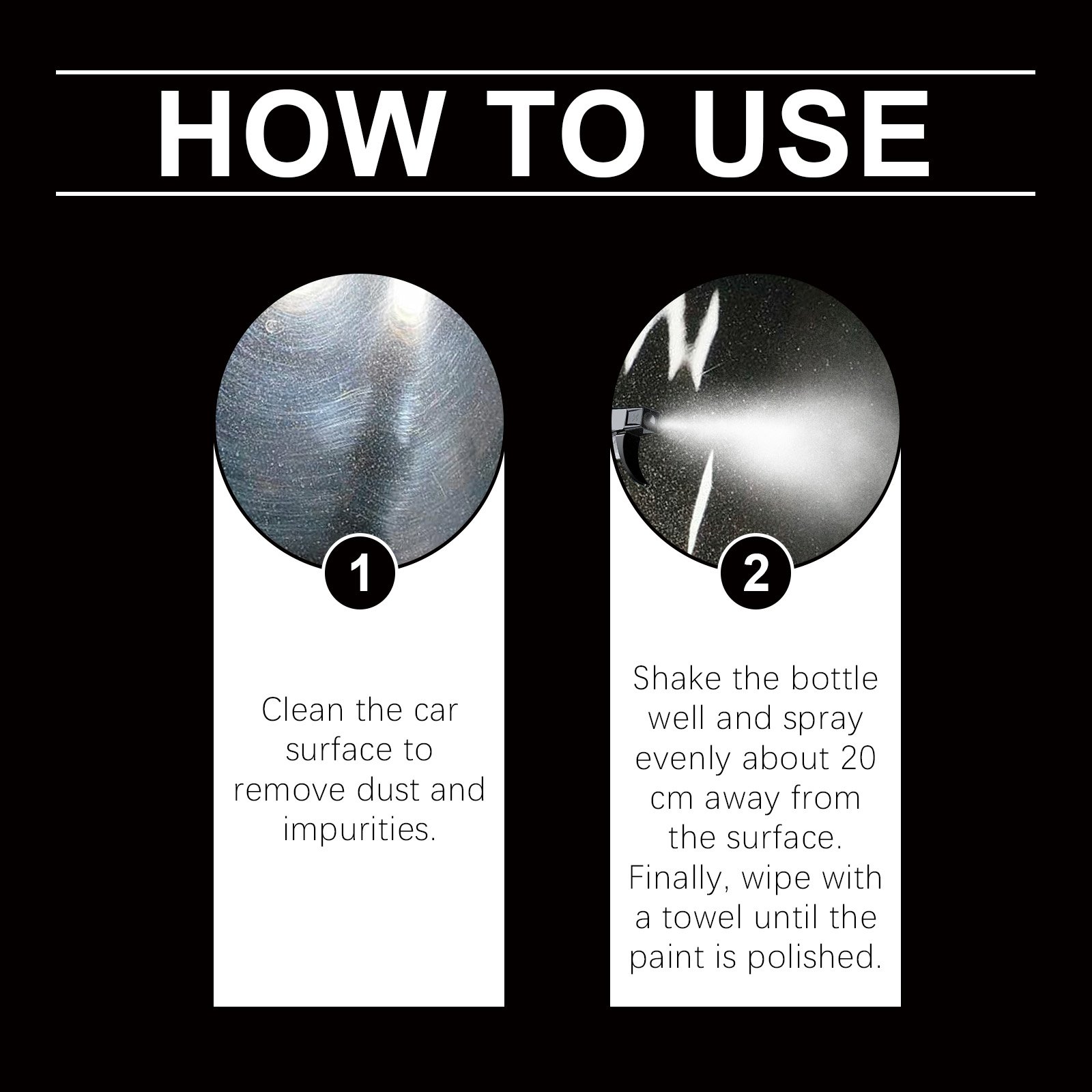Our automotive quick coating sprays contain sodium bicarbonate, lauryl polyether-7, and sodium lauryl sulfate. It can restore the luster of the car surface without damaging the original paint of the car. Its use is simple: clean the surface of the car to remove dust and impurities. Shake the bottle well, spray it evenly about 20 cm from the surface, and finally wipe it with a towel until the paint is bright. And it can form a protective film that can resist water and dirt, providing better protection for your car.