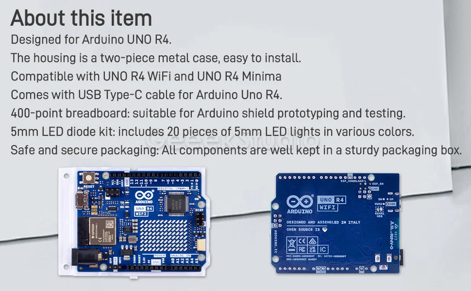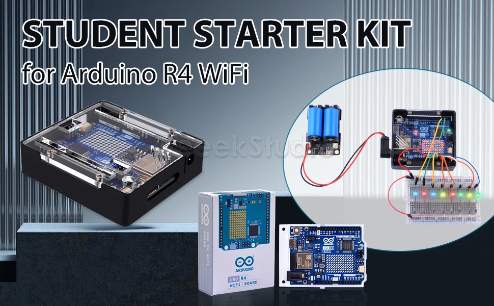 The Arduino UNO R4 WiFi Student Starter Kit is an entry-level set designed to introduce students to the world of Arduino development boards. This kit includes an Arduino UNO R4 WiFi board, a metal case, an acrylic cover, and an LED light package. It also contains jumper wires and a breadboard, which are essential for prototyping and experimenting with various electronic components .